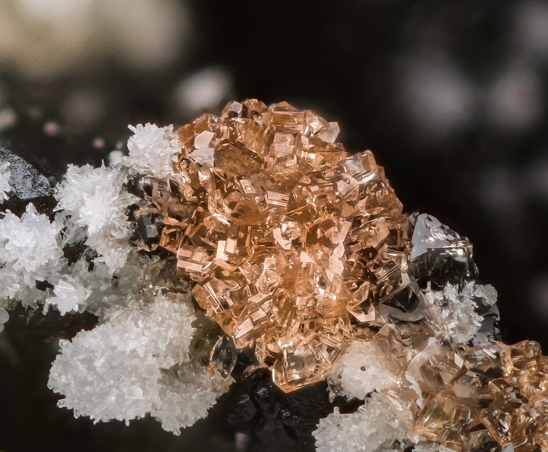 Hússzínű römerit fehér szomolnokittal a mélyszintekről. Képszélesség: 1,9 mm