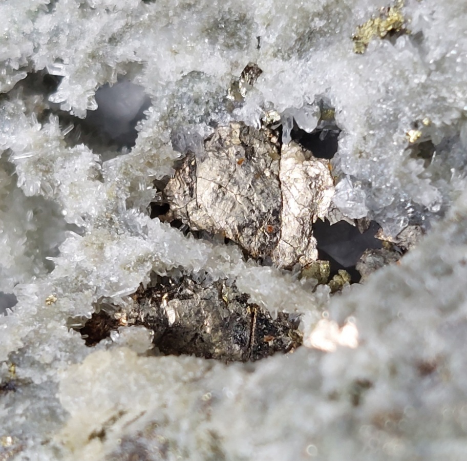 Pirrhotin tábla kvarcos üregben fennőve. -900-as szint. Képsz.:18mm
