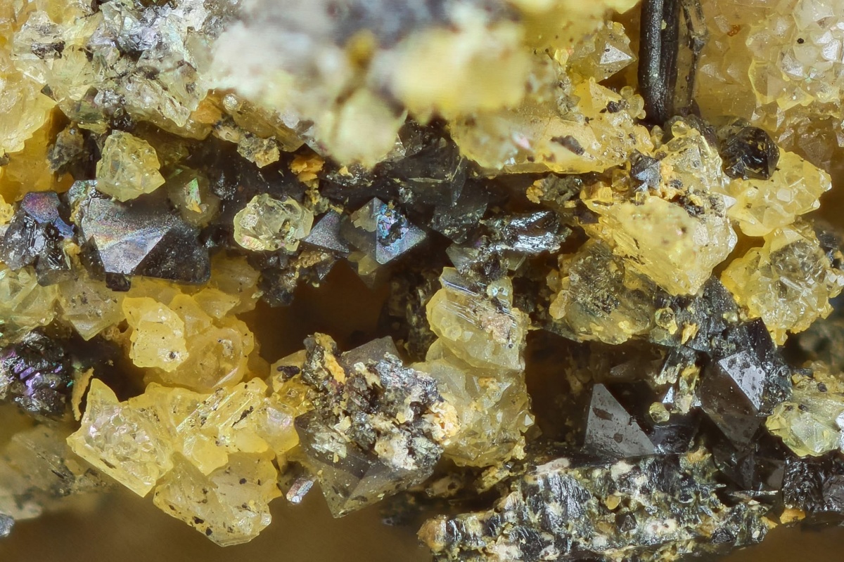 Acélszürke vagy áttetsző sénarmontit kristályok kvarcok között. Képszélesség: 2,5 mm.