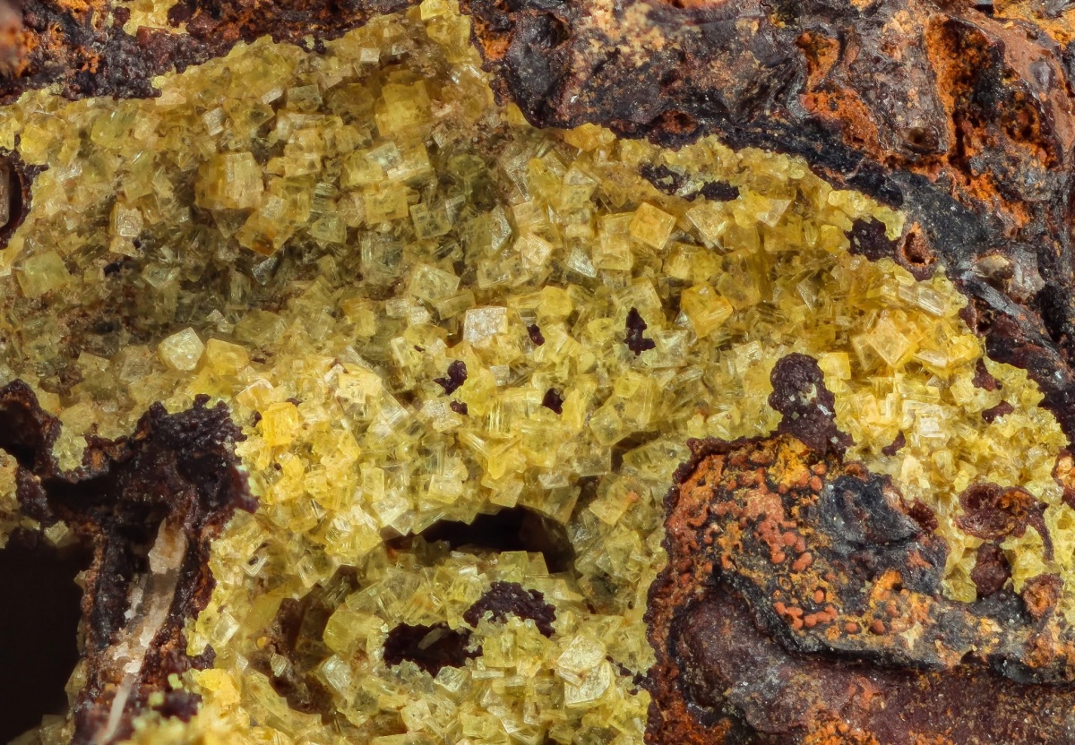 | Borsárga farmakosziderit kristályok goethites alapon. Képszéleség:3,5 mm | |